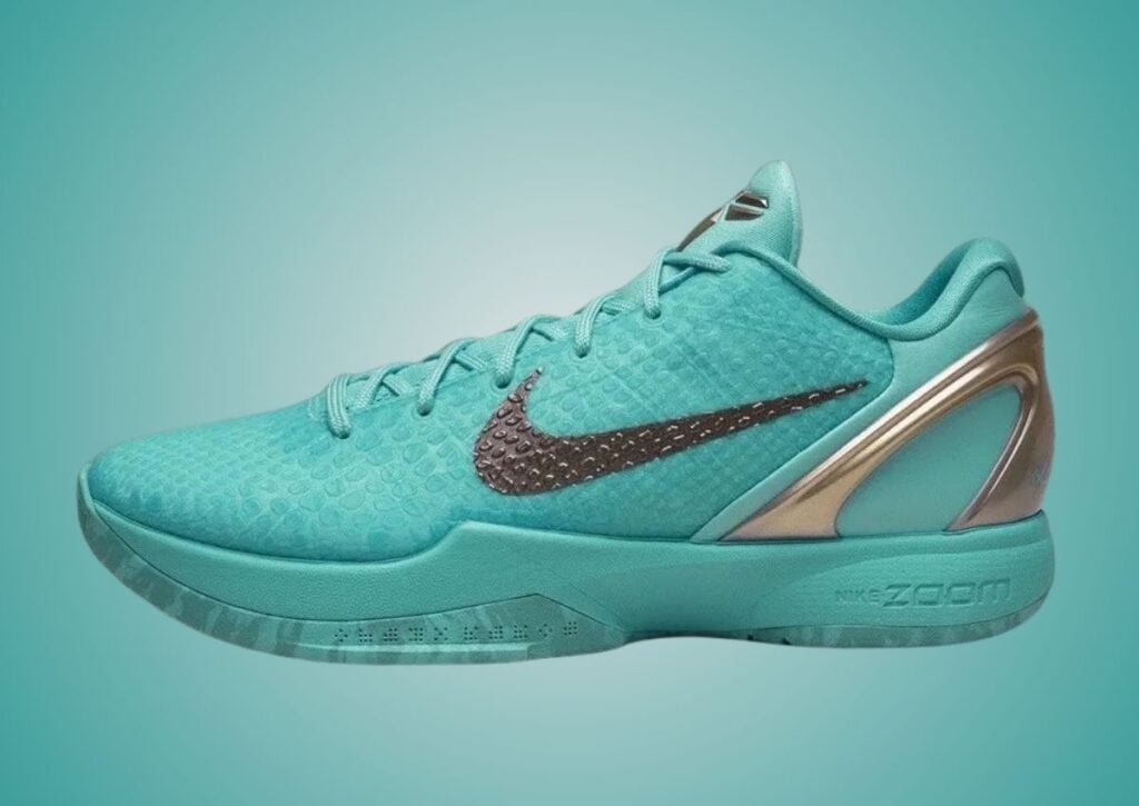 This Nike Kobe 6 Protro is dressed in a Hyper Turquoise and Metallic Copper color combination. Representing the Statue of Liberty in New York, this pair comes with Hyper Turquoise across the upper. In addition, Metallic Copper graces the heel counter and Kobe shield logo, giving patina vibes. Turquoise also graces the tongue, laces, and midsole, while the shoes have Zoom Air cushioning. The design is completed with a marbleized rubber outsole and Kobeโs signature on the heels.