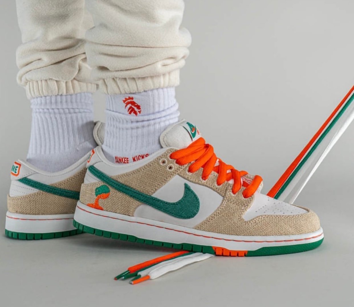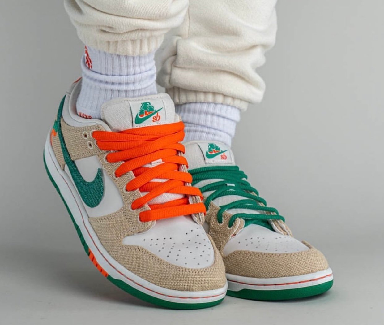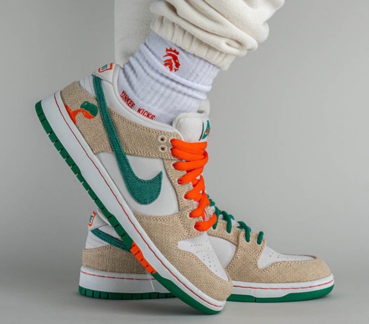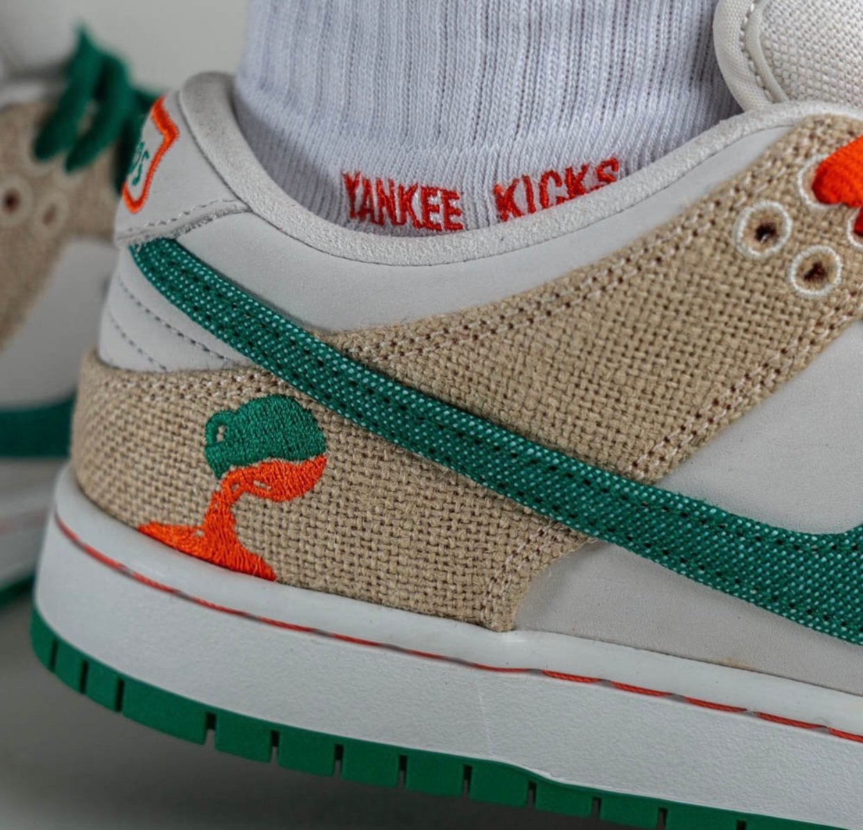This Jarritos x Nike SB Dunk Low comes dressed in a Phantom, Safety Orange, and Malachite color combination. Utilizing leather on the base while hemp appears on the overlays. Next, we have co-branding throughout, while each pair comes with special packaging.