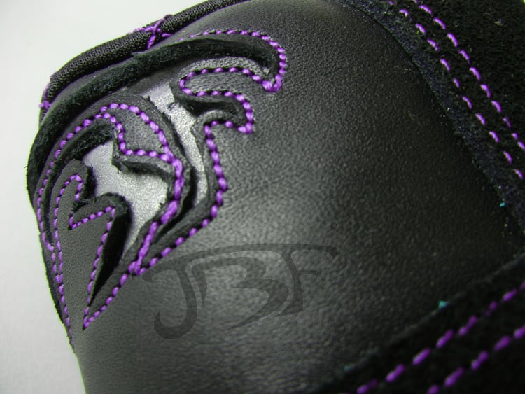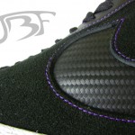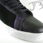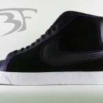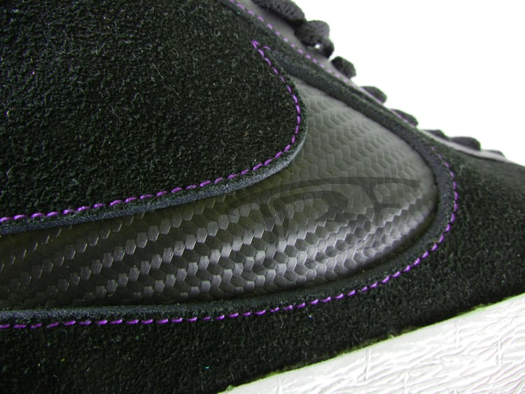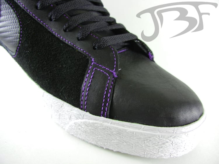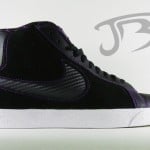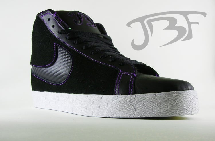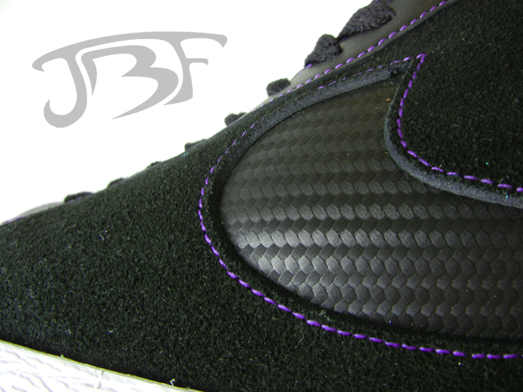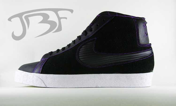 Dubbed the โShadowโ Blazer, these are done up in a fresh black suede and leather combination. The recently popular faux Carbon Fiber is placed on the Swoosh as well as purple contrast stitching throughout. As usual, JBF hit them off with his finishing touch on the heel panel by placing his logo which is done in 3M for that extra pop.