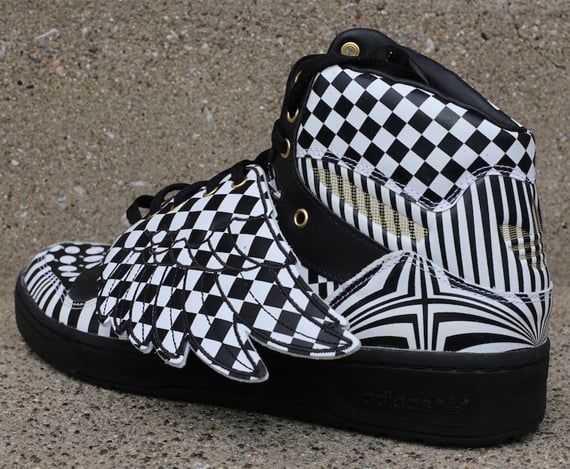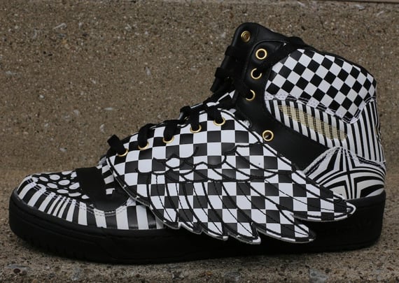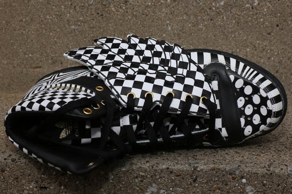 Available right now, via Oneness, for all of you sneakerheads to purchase is this pair of “Opart” Jeremy Scott x adidas Originals Wings. While the color scheme is of a simple white/black nature, this pair of kicks is far from that. Flush with a rather interesting and eccentric mix of different graphic patterns, this creatively chaotic pair of adidas Originals Wings is the perfect addition to the long list of popular Jeremy Scott designed kicks. Read on after the jump to check out a detailed look at this latest pair of Jeremy Scott x adidas Originals Wings and be sure to head over to Oneness right now to cop.