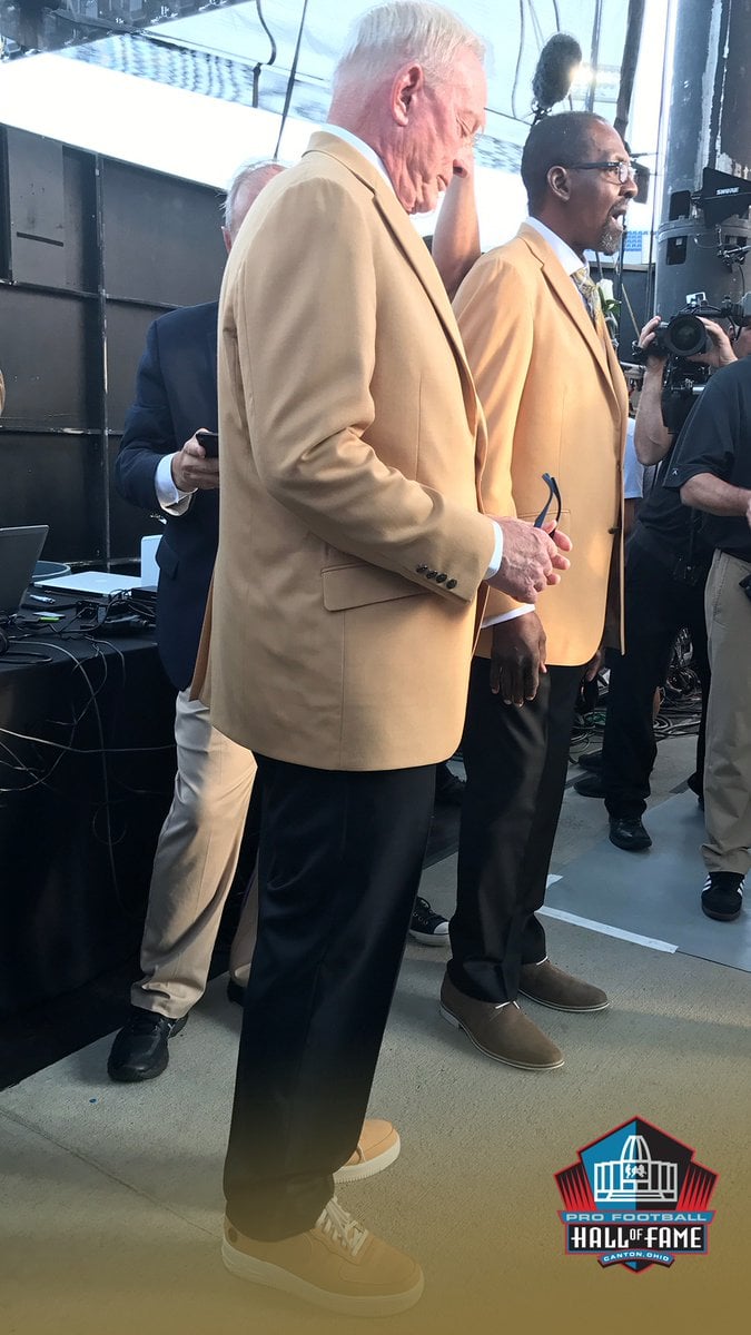 Nike is helping Jerry Jones celebrate going into the Hall of Fame. Recently Phil Knight gifted him with a special edition Nike Air Force 1 Low which matches perfectly with the Hall of Fame Gold jacket.