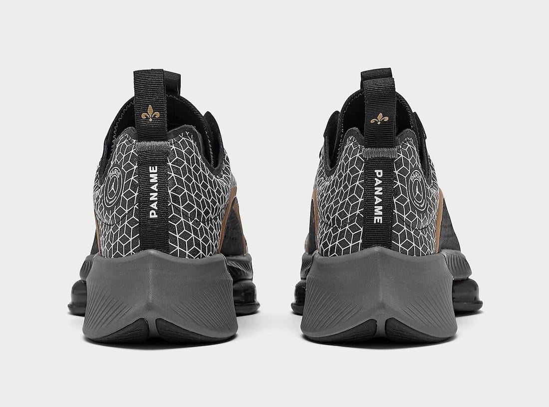 Dressed in a Black, Bordeaux, White and Metallic Gold color combination. Looking closer this Jordan Air Zoom Renegade comes with all-over print across the upper while Gold accents are seen throughout and Bordeaux lands on the tongue. In addition we have โPSGโ branding by the heel and โPanameโ on the heel. Finishing the look is an exposed cushioning pod which is similar to the AlphaFly Next%.