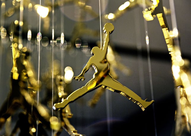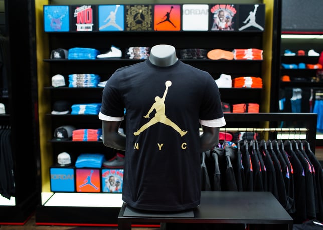 As consumers filed into the store, they were immersed in the style that all have come to expect from Jordan Brand โ elephant print walls thatย nod to the Air Jordan III andย flooring emblazoned with the retro โWingsโ logo โ alongside modern interactive video displays. The storeโs centerpiece is a spectacular, custom โ23โ chandelier made of 340 individual gold Jumpman logos.