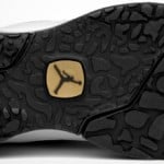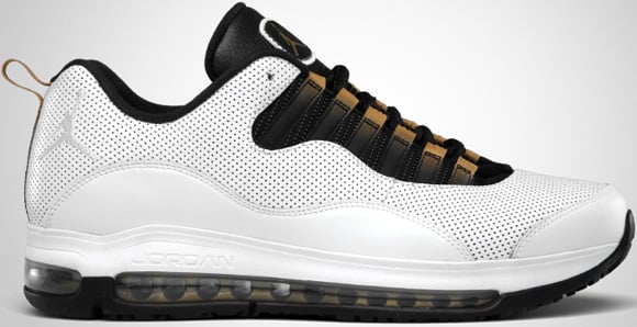The touches put on the Jordan CMFT Air Max 10 LTR White/Metallic Gold-Black are perforated white leather uppers, black to gold gradient on the lace loops, Air Max 97 midsole and air bubble. Price tag is $135.