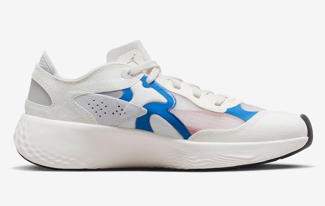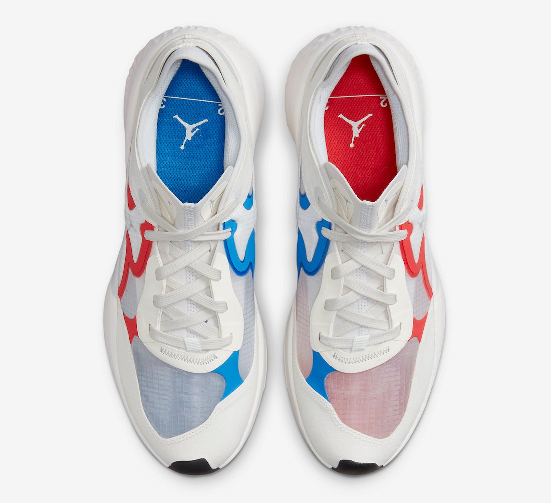 Looking closer, this Jordan Delta 3 Low features a transparent grid pattern on the upper constructed with synthetic. Red lands on the lateral overlays and Blue appears on the medial side. The two main shades then hit the insoles with Jumpman branding throughout. Other details include a White midsole and a Black rubber outsole.