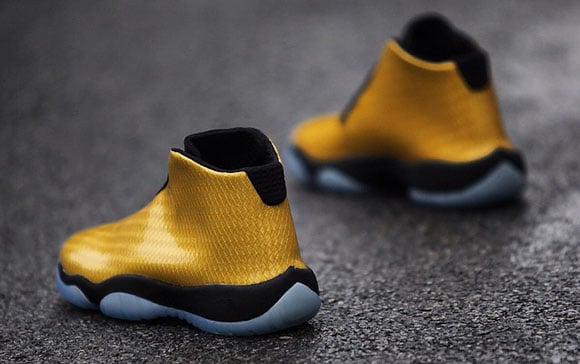 The gold Jordan Future’s are somewhat unique due to their gloss finish on the uppers and the textile upper. They appear to look like a fish, but I doubt they will get the nickname ‘goldfish’ anytime soon. Black is used on the midsole, tongue, laces and heel while JB adds a translucent sole.