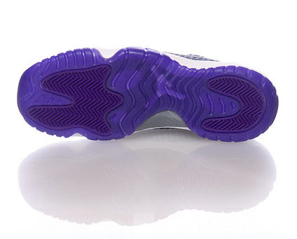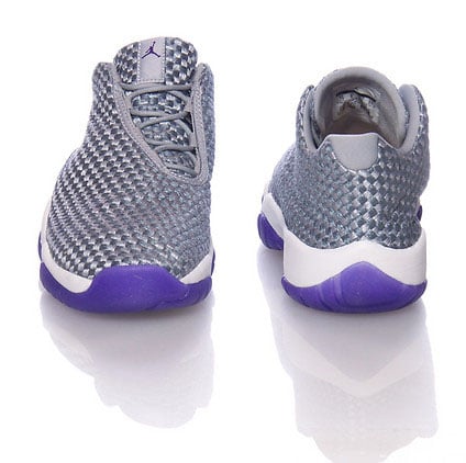 The Jordan Future Low GS shown features a mixture of wolf grey and cool grey through the woven uppers and liner. White will hit the midsole while purple lays on the outsole and sole.