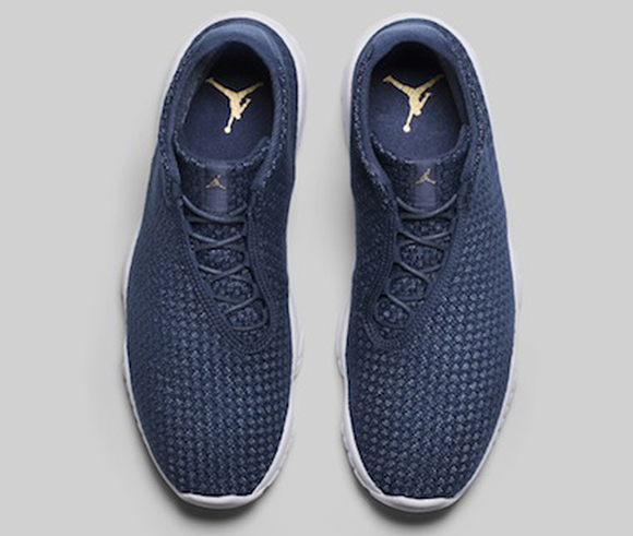 Midnight navy will bless this Jordan Future on the uppers. JB used the traditional woven material, while adding a solid white midsole. One the sole is a few translucent windows, while gold accents the Jumpman on the tongue and insole.