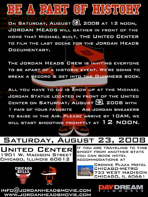 In an attempt to document the legacy of the Air Jordan line and break a Guinness Book World Record, the Jordan Heads group is calling for people to show-up to discuss their favorite Air Jordan. This seems like a great way to capture the essence of the Jordan Brand and its products. The shoot will be held on August 23rd, 2008 in front of the United Center in Chicago, be sure to be there around 10 a.m for early arrival.
