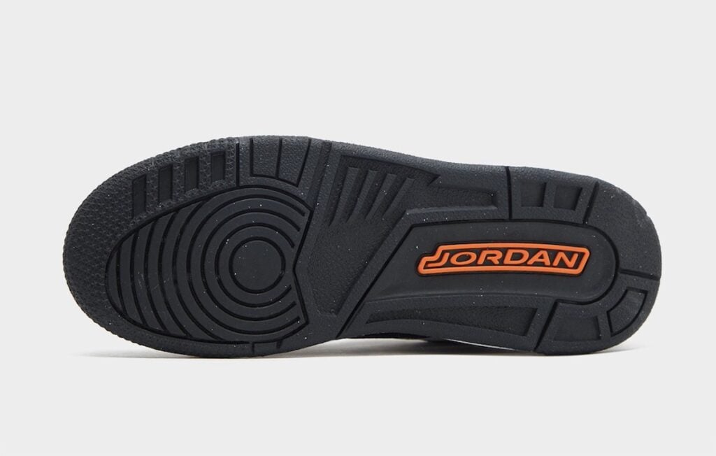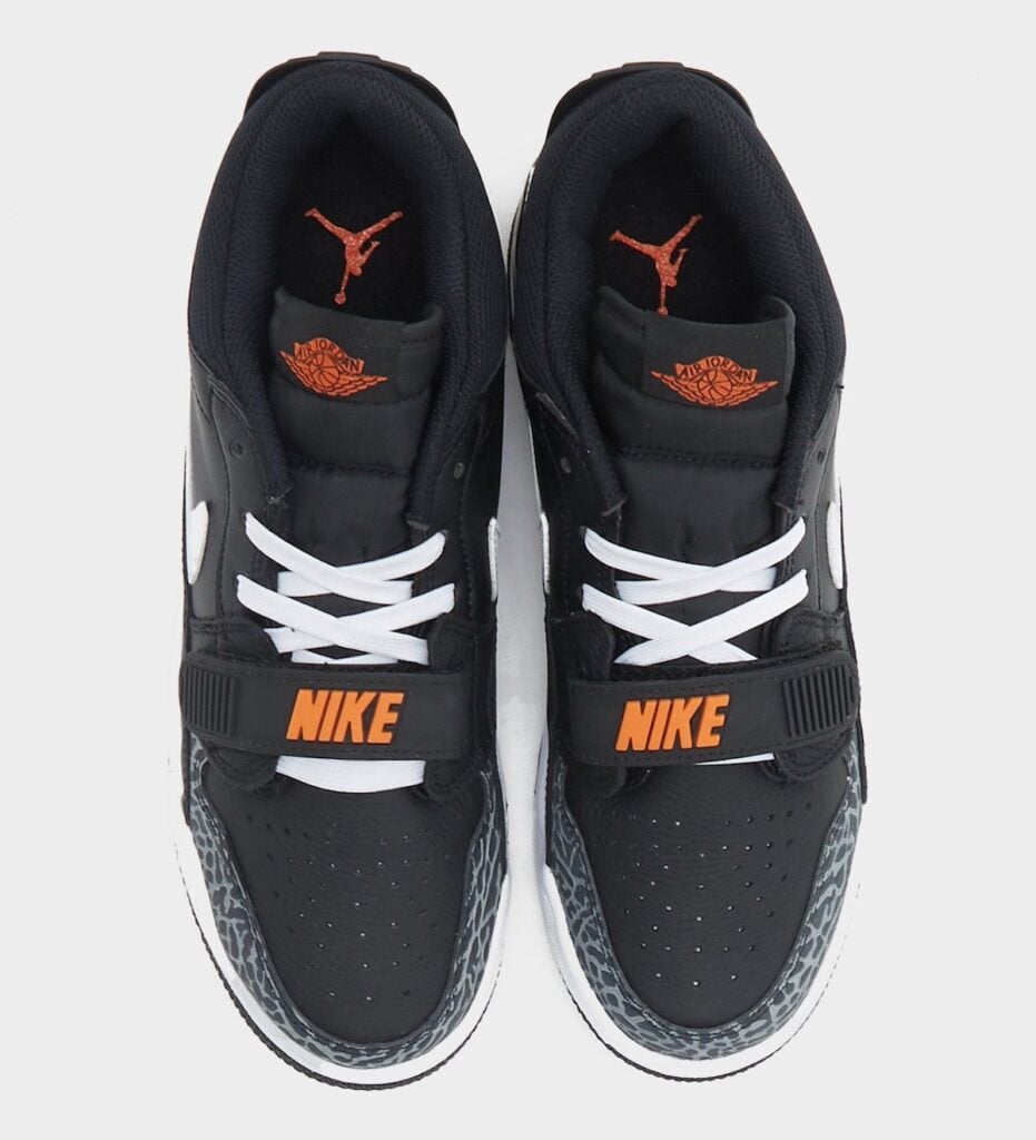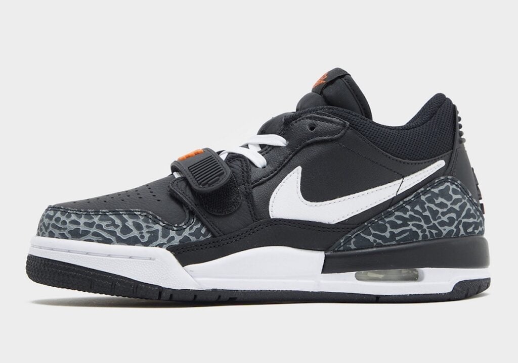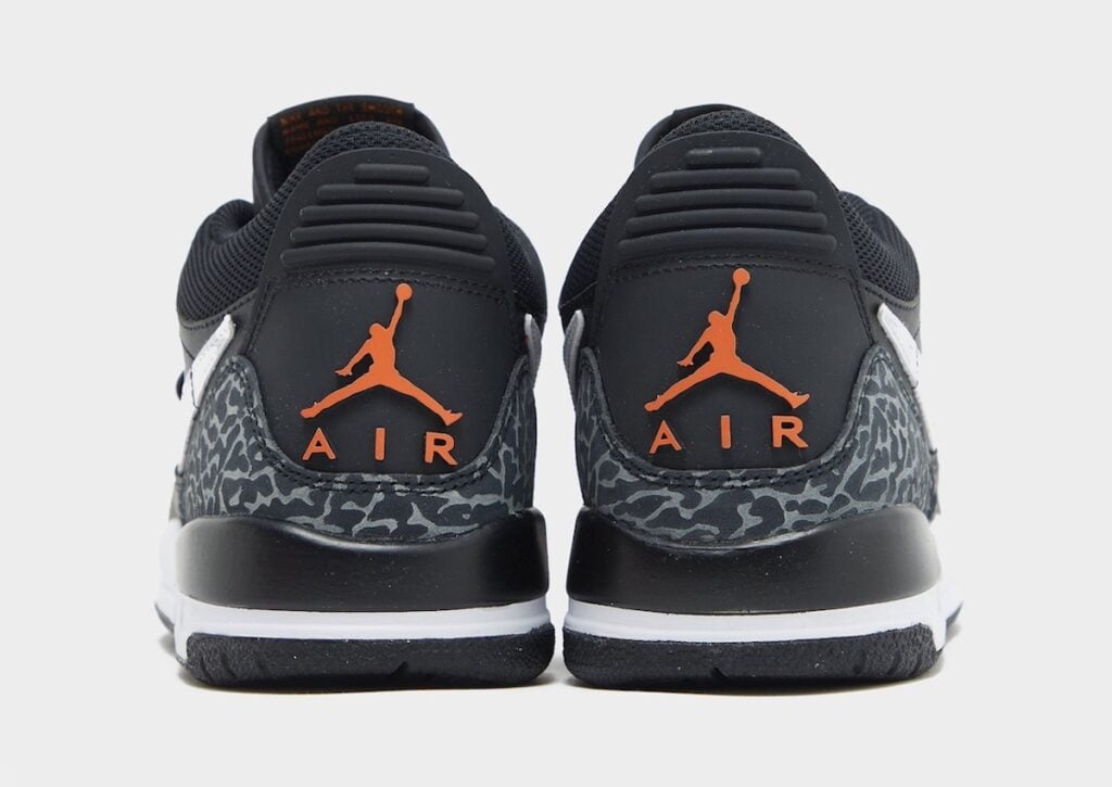 As you can see, this Jordan Legacy 312 Low comes in the same color scheme as the Jordan 3 Fear. Highlighted with Black leather across the base, the same shade adorns the nylon tongues, and we have the signature perforations across the toe box. Elephant print wraps the toe and heel while achieving the โFearโ look, Orange fills in the Wings tongue branding, Nike on the mid-foot strap, and the Jumpman on the heels and insoles. Other details include White on the Swoosh logos, midsole, and laces, and a visible Air unit in the heels.