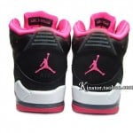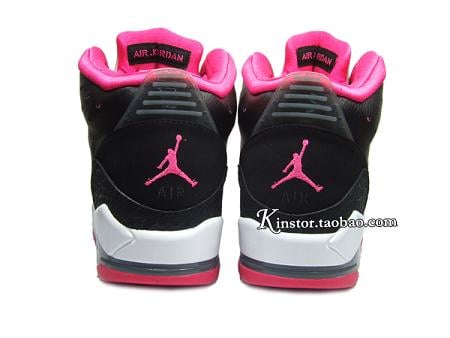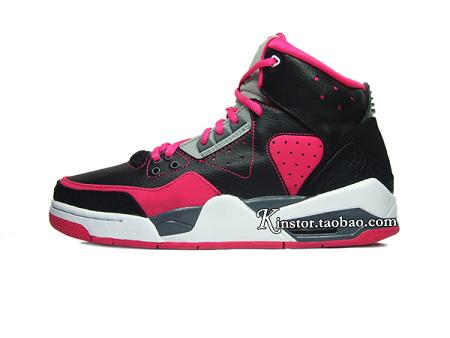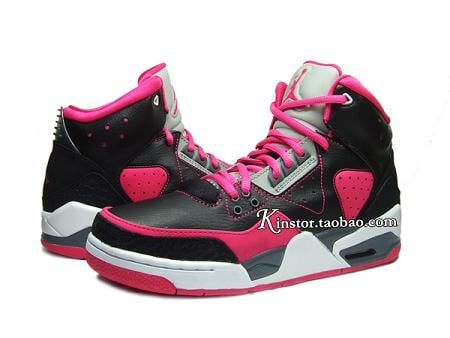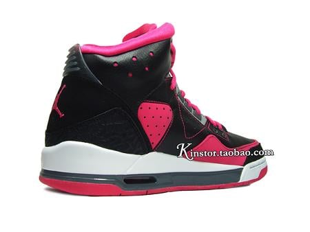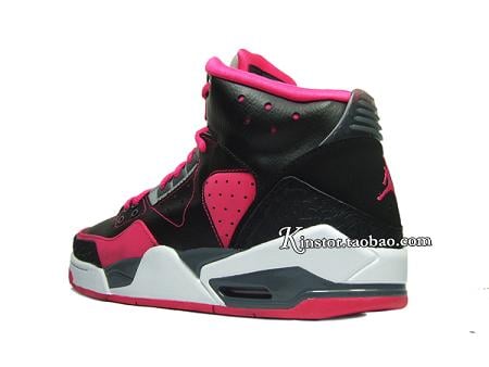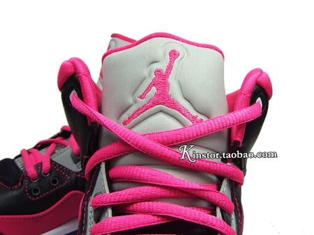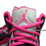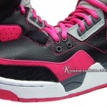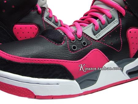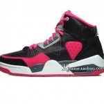 This GS version is made of a simple yet eye catching color combo of black/ pink/ grey and white. Predominantly black leather upper with pink contrast stitching, side panel and toe wrap make up the base of this shoe. While a white and grey midsole sitting atop the pink outsole does look appealing, yet the overall design is a bit much.