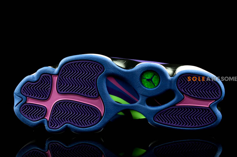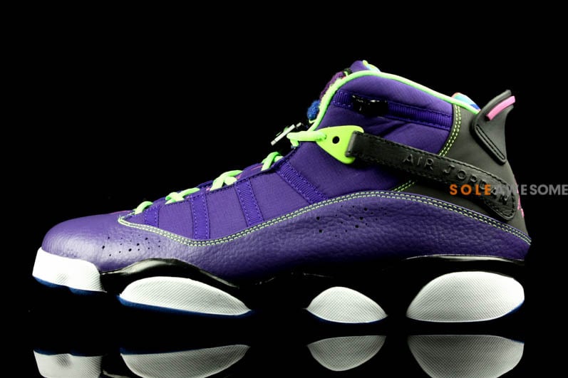 A hybrid model first introduced back in 2008, this latest Air Jordan Six Rings offering displays a predominately purple-based tumbled leather upper with tonal mesh overlays, contrast electric green accents throughout, hits of hot pink, and a graphic inner lining that resembles classic ’90s fashion and culture. Finished off by a black and white heel counter and midsole, let us know what you think about this mock up in our comments below.