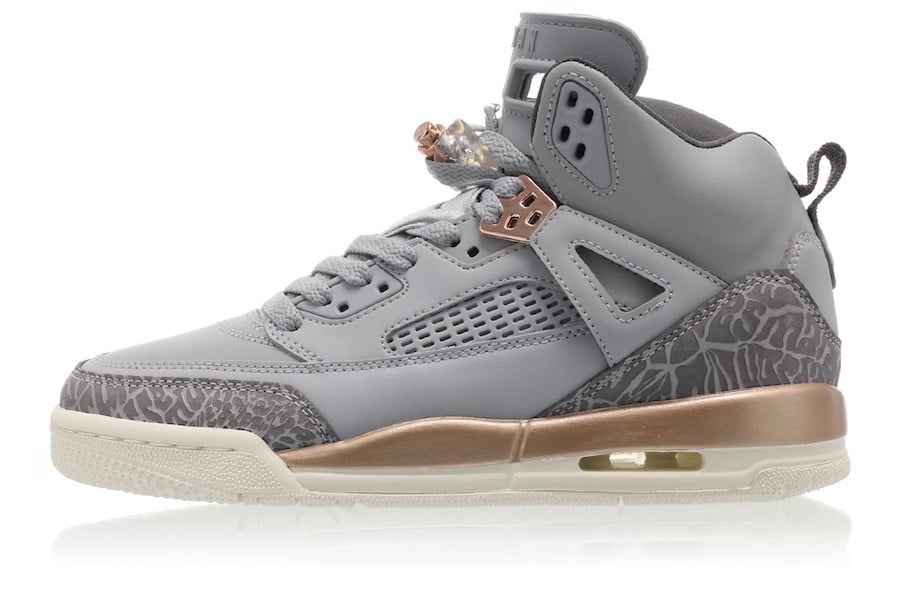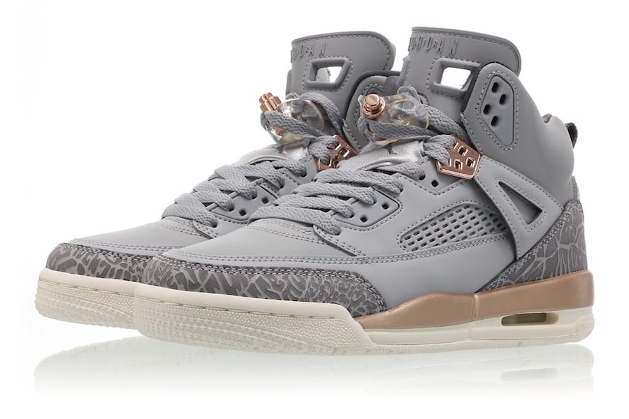This Jordan Spizike features a Wolf Grey, Dark Grey, Metallic Red Bronze and Sail color theme. Across the uppers, tongue, toe and elephant print we have the use of Grey while Metallic Red Bronzeย hits part of the midsole, lace locks and wing eyelets. Completing the look is Sail which runs across the lower part of the midsole and extends to the outsole.