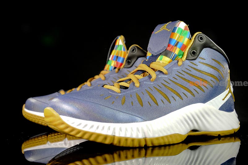 The “Washington” Jordan Super Fly pairs a grey Hyperfuse upper with basketball-specific Lunarlon cushioning, a white midsole, white external heel counter, a colorful patterned tongue and gold accents on everything from the lining and branding to the laces, strategic cutouts, lining and rubber outsole.