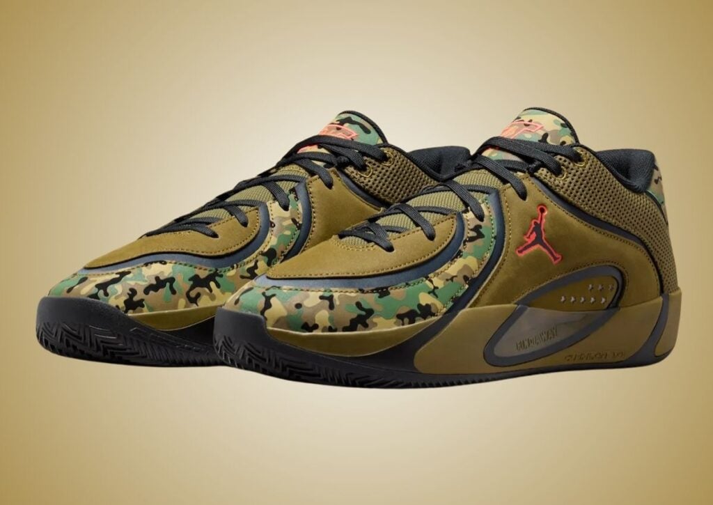 This Jordan Tatum 4 is dressed in a Black, Moss Green, Camper Green, and Infrared 23 color scheme. Camo wraps across the forefoot and tongue, highlighted by Olive overlays and breathable mesh. Dark panel accents frame the camouflage, and it comes with pops of Infrared on the Jumpman logo and Tatumโs tongue badge. Furthermore, the perforations on the panels are star cut-outs.