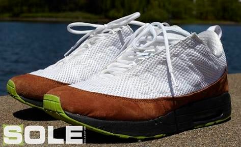 The Air Max 1 outsole is obvious. Itโs the subtle hints of the Air Jordan IX however that make this pair of kicks quite interesting. An olive mudguard is seen wrapping itself around the base of the shoe. A mesh upper is in place with the Air Jordan IXs mid foot panel stitched on top, as well as the heel pull tab on the rear.