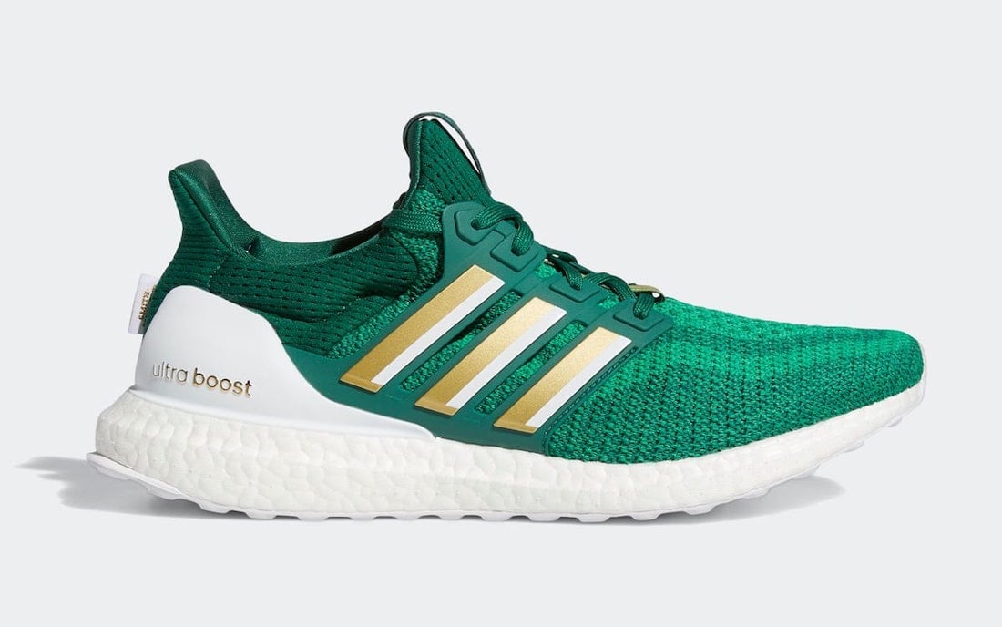 Looking closer, this adidas Ultra Boost comes dressed in his schoolโs colors of Green, Gold Metallic, and White. Furthermore, the pair features Green Primeknit on the laces as well as the laces and lace cage. The Three Stripes branding on the sides come in Metallic Gold and White. In addition, more Gold accents the tongue and insoles while White appears on the heel counter. Highlighting this pair, we have โSmith-Schusterโ on the heel label and โ562โ inside of the tongue. Finally, a White Boost midsole and matching rubber outsole finish the look.