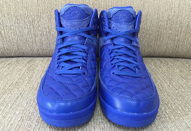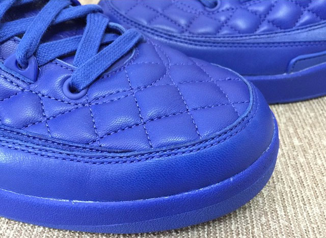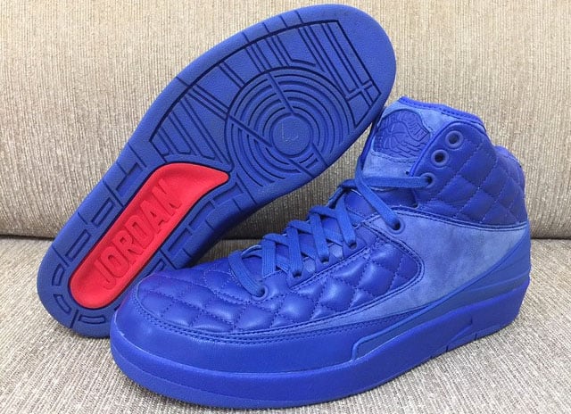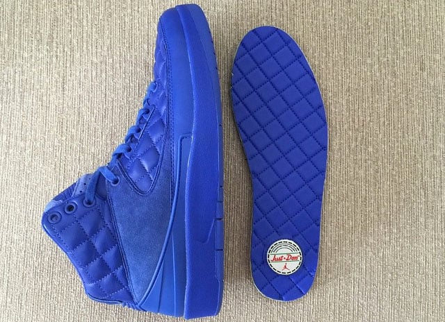 The Just Don x Air Jordan 2 uses a blue quilted leather upper while blue suede hits the tongue and sides. For a luxury look and feel Jordan Brand has also added wax laces with gold tips.