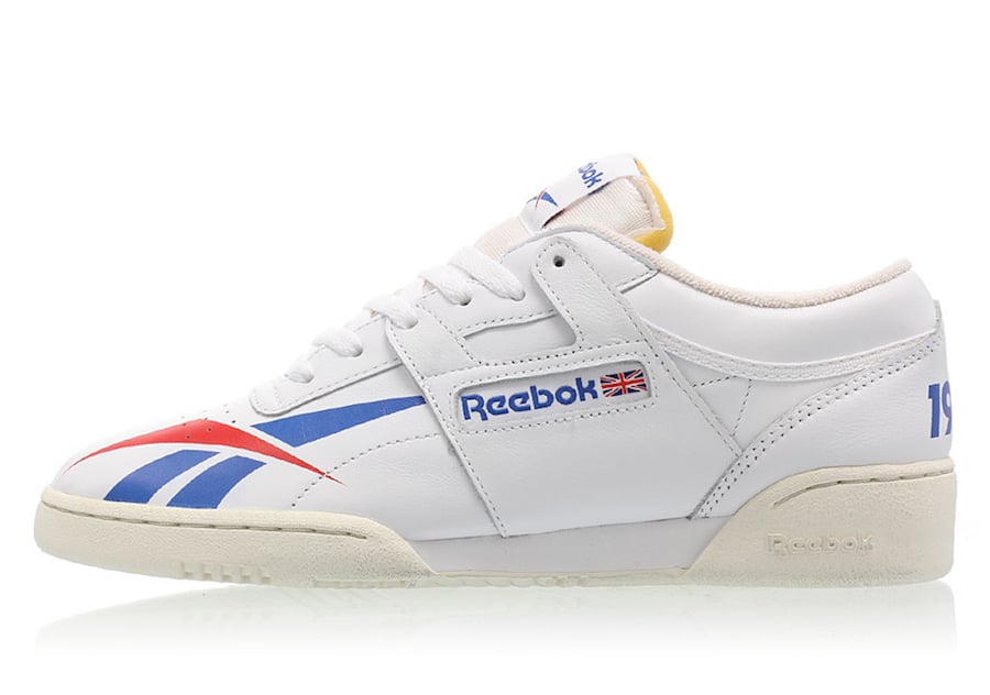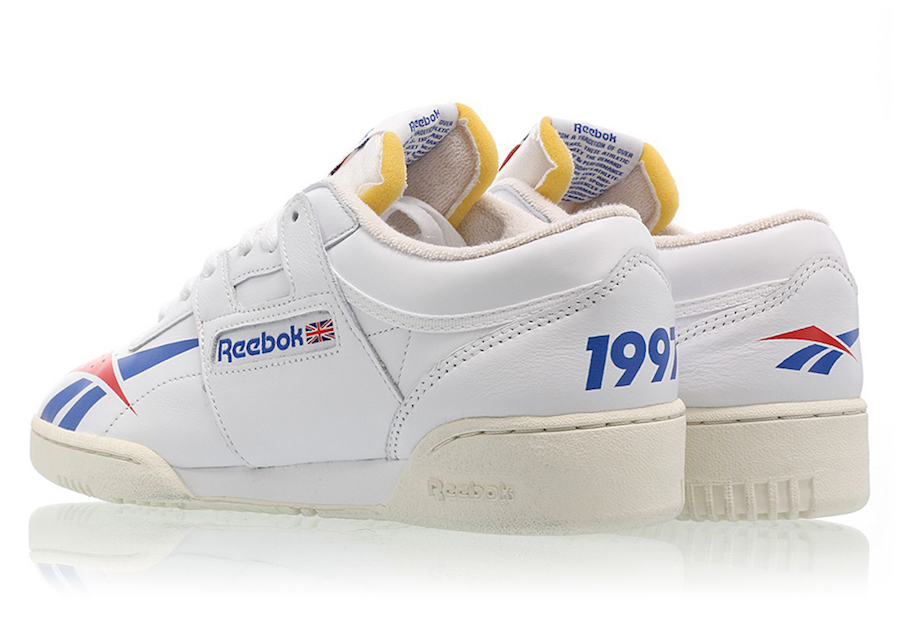 Looking closer, this Reebok Workout features White leather across the uppers while an oversized vector logo lands on the toe. Following we have Red and Blue used on the Reebok branding while โ1997โ lands on the heel which is when the store opened. Finishing the look is Off-White on the midsole and outsole which gives them a vintage look.