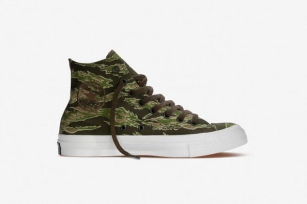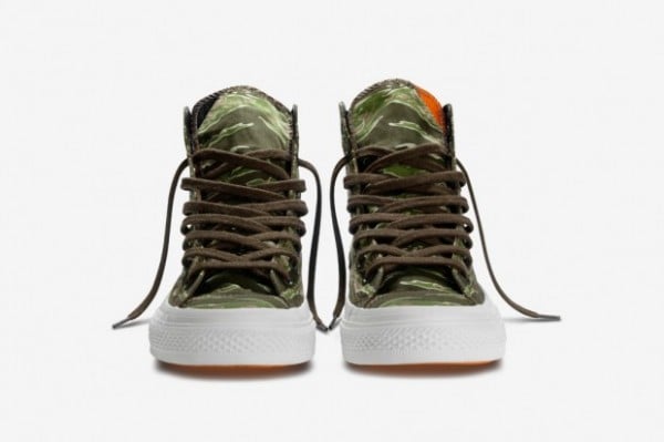 The All Star first seen worn by Wiz Khalifa at the BET Awards earlier this month, features a brown, tan, and olive tiger camouflage patterned upper, orange lining + laser engraving on the shoe’s insoleย and back tongue, and not to mention the classic white rubber mid and outsole.