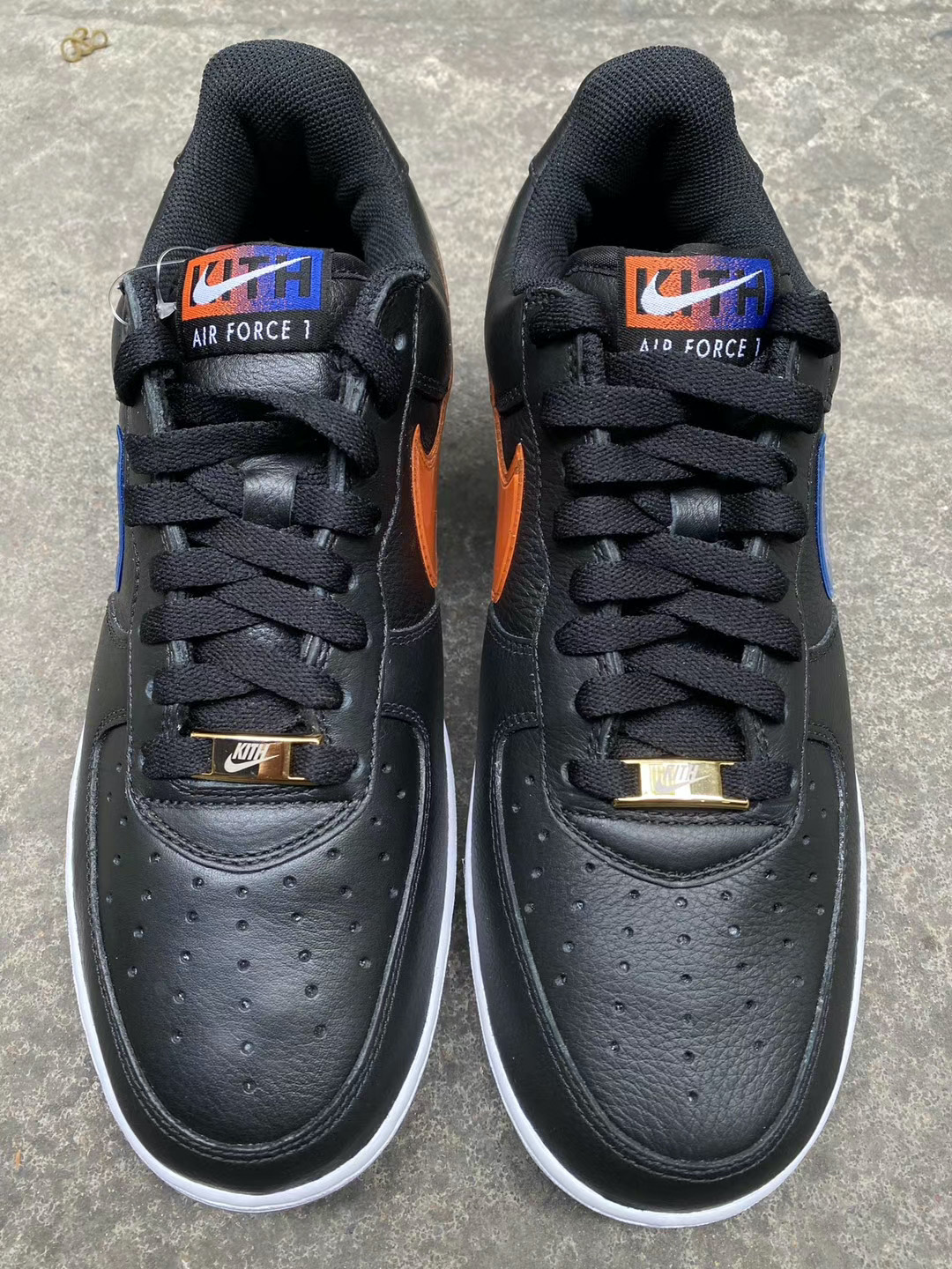 Update (7/23): First look at the NYC-inspired Kith x Nike Air Force 1 Low in Black, Team Orange, Black, and Rush Blue. Highlighted with Black leather across the upper and a mismatched semi translucent TPU Swoosh logo comes in Orange and Blue. In addition, we have Kith branding on the tongue tags and embroidery by the heel. Other details include Metallic Gold lace dubraes, White on the midsole, and an icy translucent outsole.