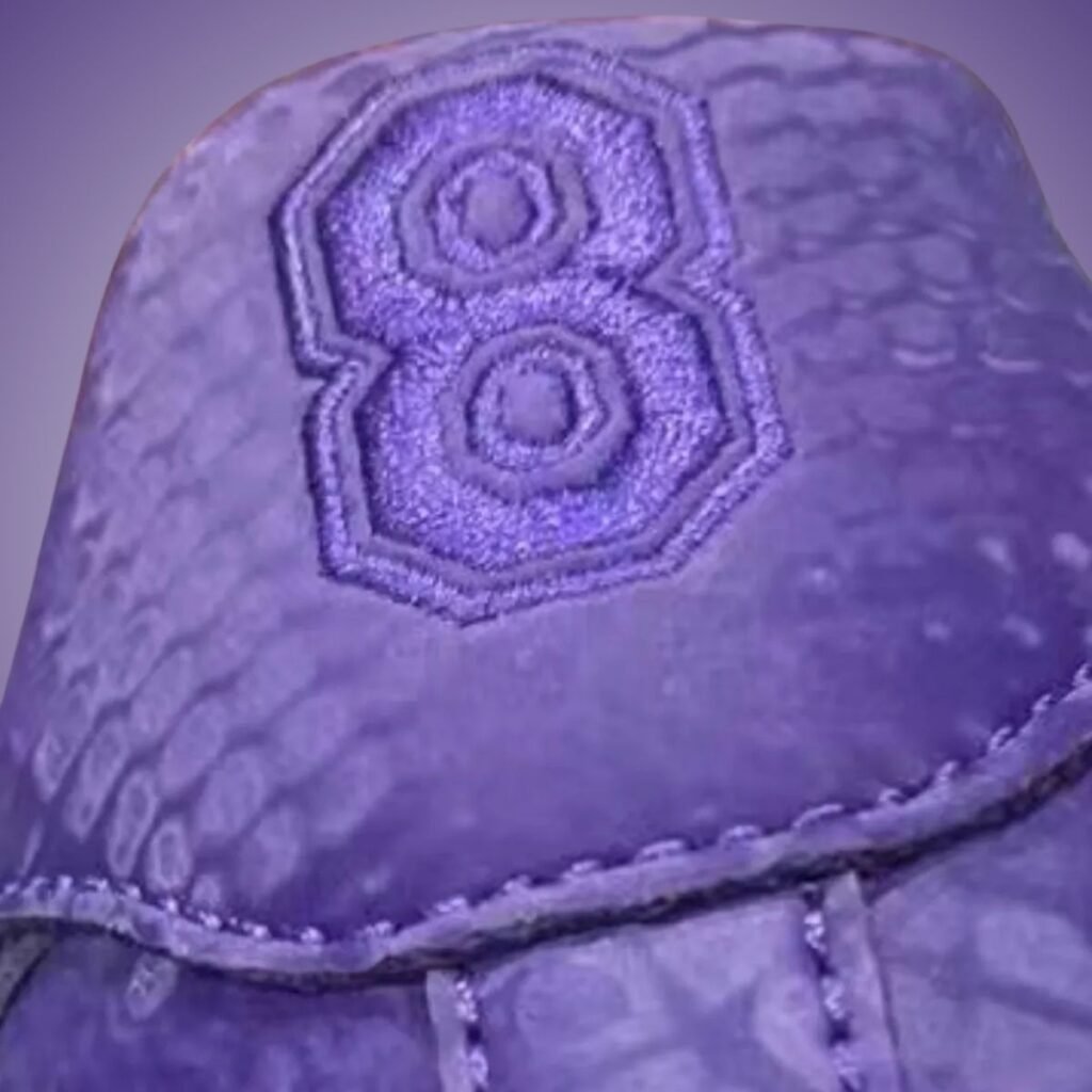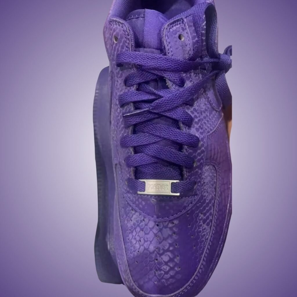 This Nike Air Force 1 Low is covered in Court Purple, but what makes this pair unique is what goes into it. As you can see, the shoes feature snakeskin detailing across the upper, giving the shoes an exotic feel and connecting to Kobeโs โMambaโ moniker. Kobeโs numbers โ8โ and โ24โ are embroidered on the heels, while the lace dubrae reads โForever.โ The design is completed with the Kobe shield logo on the lateral side, Purple on the midsole, and a matching rubber outsole.