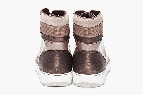 We haven’t heard about Lanvin sneakers since back in mid-June where we got a look at some high- and low-top heat. Today, we take a look at a bronze high-top sneaker from Lanvin that comes with a funky design along the entire upper. Moreover, the brand uses a mix of leather and patent leather, set off by an interesting sole in both white and grey. However, these aren’t necessarily inexpensive, so you might want to think about starting to save up before chasing a pair of these down.