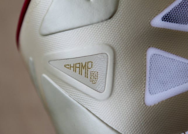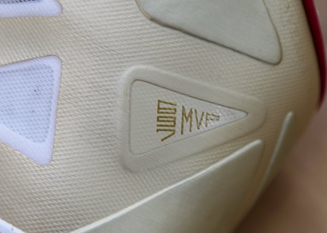 The shoe also features graphics representing the championship. On the right shoeโs medial side isย “MVP” plus the number of points he scored in the playoffs. The left shoe’s medial panel has “CHAMP” and the team’s playoff record.ย The font mimics traditional ring inscription.