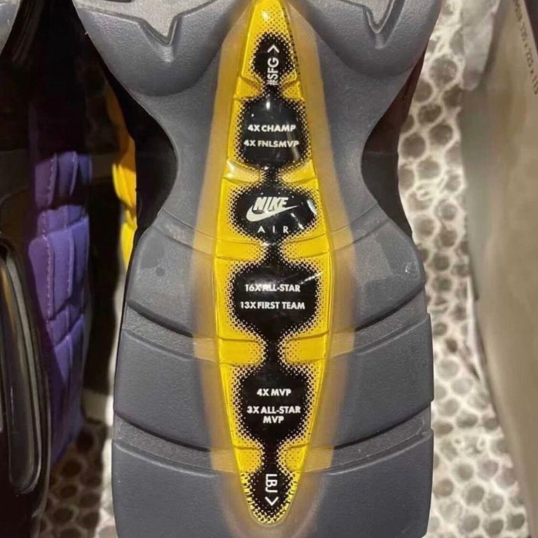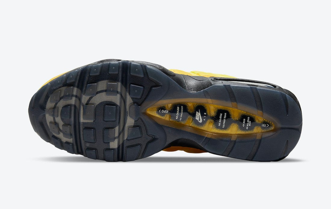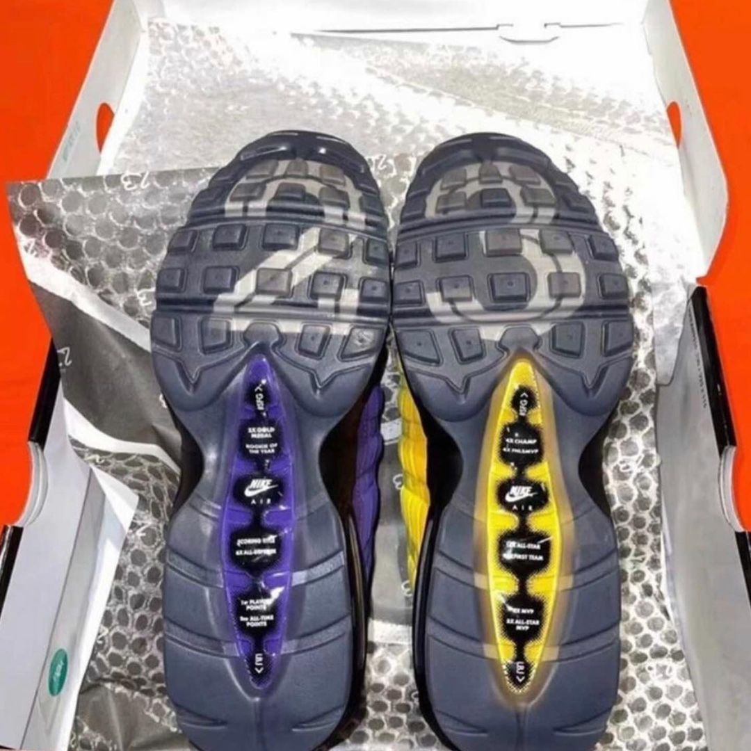Looking closer, this LeBron James version of the Nike Air Max 95 features a mismatched design while the left shoe features Gold and the right comes in Purple. The two will also utilize Purple and Gold accents, which are swapped depending on the main color used on the base. The shades will land on the eyelets, heel, and within the Air Max unit. The highlight of this pair is its translucent outsole which shows LeBronโs career accomplishments with โ2โ and โ3โ on the forefoot. Lastly, we have LeBronโs branding on the tongue. Each pair will also come housed in an OG Air Max box. However, the colors used are Purple, Black, and Gold and features King James branding.