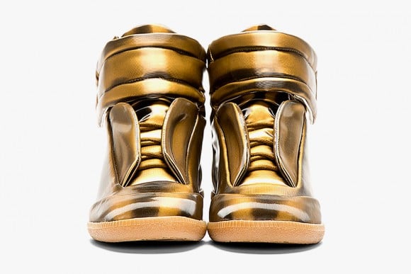 Maison Martin Margiela is back in action this spring with the release of their latest footwear offering. Covered entirely in metallic copper, the Maison Martin Margiela Copper Glossy Vinyl High-Top Sneaker is a definite statement maker. These pair of high tops strike a strong resemblance to the Maison Martin Margiela Metallic Gold Mirror. The shoe has a rounded toe cap, and also has a tonal stitching . Complete with an ankle strap, and tan rubber sole, these designer kicks are going for $940 over at SSENSE.
