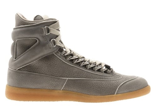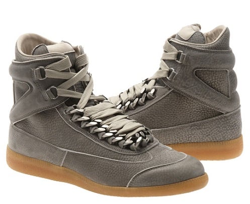 It’s been a while since we wrote about an offering from Maison Martin Margiela, but that drought is over. Pictured here is the brand’s latest take on its high-top chain sneakers with a gun metal suede upper, interesting chain links to hold together the shoe laces, and a completely gum outsole. Maison Martin Margiela carriers have these in stock now.