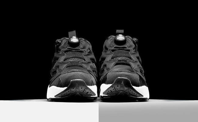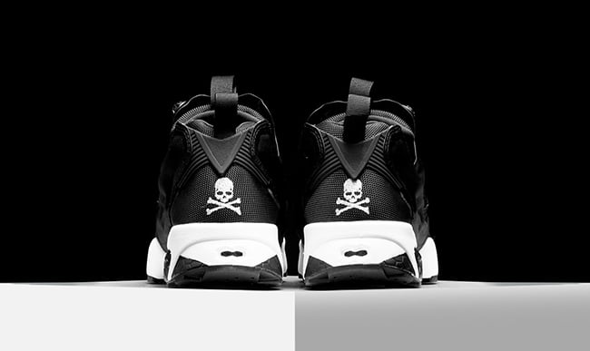 The release is on the similar side of things, while using a simple black and white color theme. However the highlight is Mastermind’s branding which is a skull and crossbones which lands on each of the heels and Pump. Other details include an all black base while white fills in the midsole and branding.