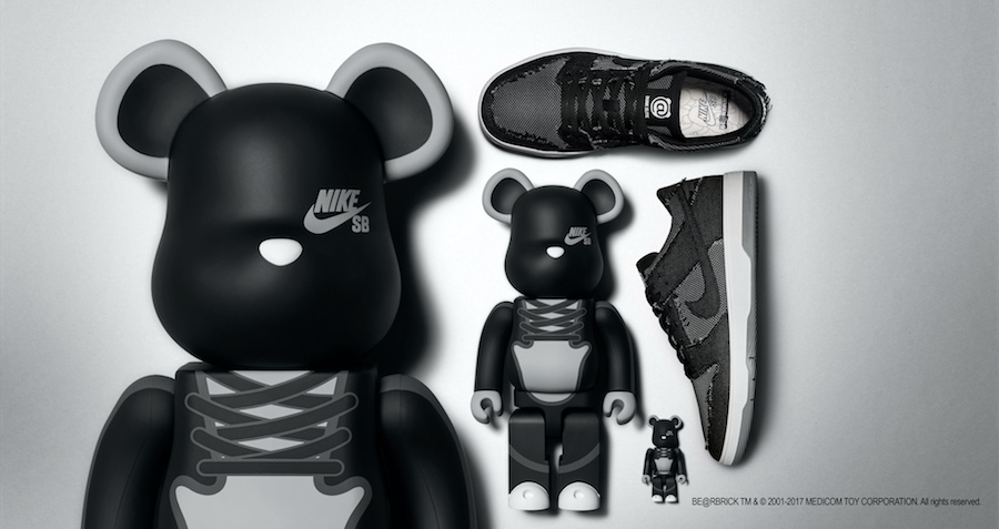 The initial Nike x MEDICOM TOY shoe, a white Nike SB Dunk with college blue and orange accents, released in 2004, and the Nike SB Dunk MEDICOM TOY Black Denim followed in January of 2005. With its medium grey/black denim upper, the shoe played perfectly for skate and street, and was immediately recognized as a certified grail. Other shoes that followed toyed with an ever-inventive palate of materials โ including reflective 3M, Gore-Tex and even faux fur โ the MEDICOM TOY Black Denim remained the benchmark.