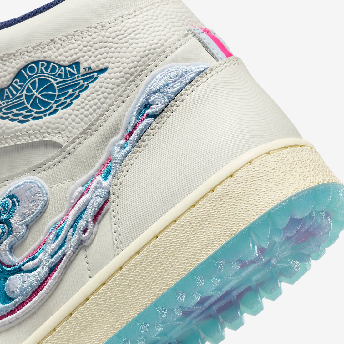 Her Air Jordan 1 Golf comes dressed in a Sail, Hyper Pink, Coconut Milk, Midnight Navy, and Industrial Blue color combination. Constructed with Sail leather on the upper, while the Swoosh is inspired by waves. Next, we have โAlphaโ printed on the translucent outsole, a tribute to her Hawaiian and Korean roots. Other details include tongue labels with her logo and a special graphic on the insoles.