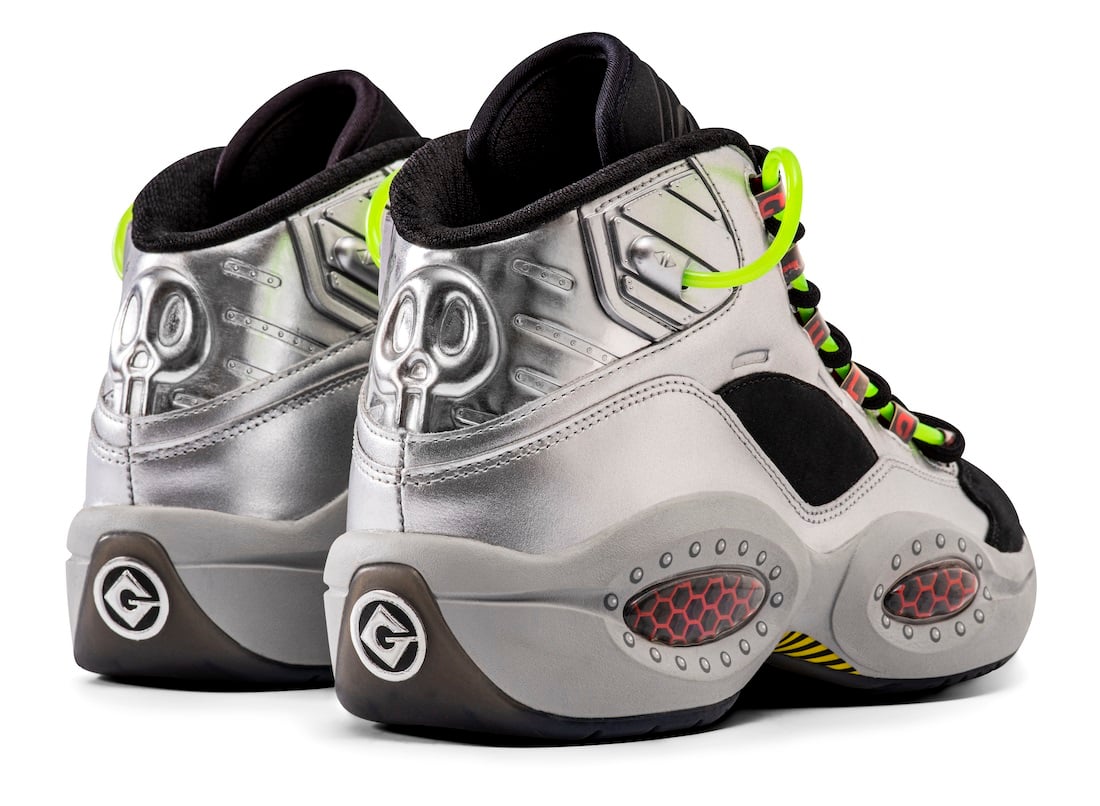 An imaginative modification of the historic Question Mid inspired by a young Gru for the โbaddestโ baller of all-time, Allen Iverson, this silver/black execution injects glow-in-the-dark sticky โslimeโ into the outsole through two intake and outtake tubes to achieve impossible grip on court, while adapted rocket booster graphics underfoot propel any undersized villain to the rim. Using different โmetalsโ from around Gruโs lab to form a mostly unpolished silver upper, while a more-finished glossyย chrome leather panel at the heel pops above his signature โGโ logo stamped in place of the traditional Iverson โ3โ.ย Looking inside,ย wearers will find asymmetric double-sided โtrap doorโ sock liners – a first-of-its kind sneaker innovation – that each hide top-secret elements from Gruโs lab on the underside.ย Available in adult sizing.
