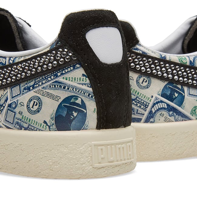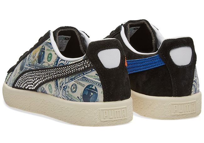 The Puma Clyde is known as Walt โClydeโ Frazierโs signature shoe when he played for the New York Knicks. Tributing the release to him, they feature $1,000 bills over the sides with Waltโs face. Following we have Black suede which lands on the toe, eyestays and tongue. The Puma branding on the lateral side features Diamond studs while the lateral branding comes in Blue and Orange for his time with the Knicks.