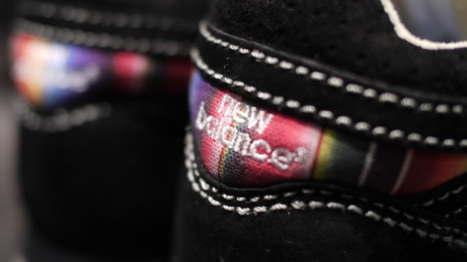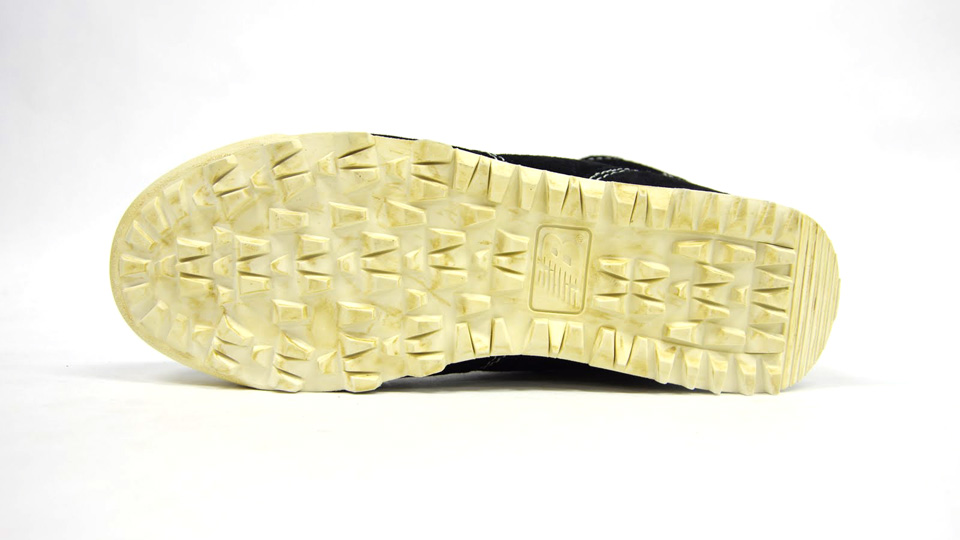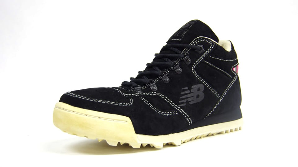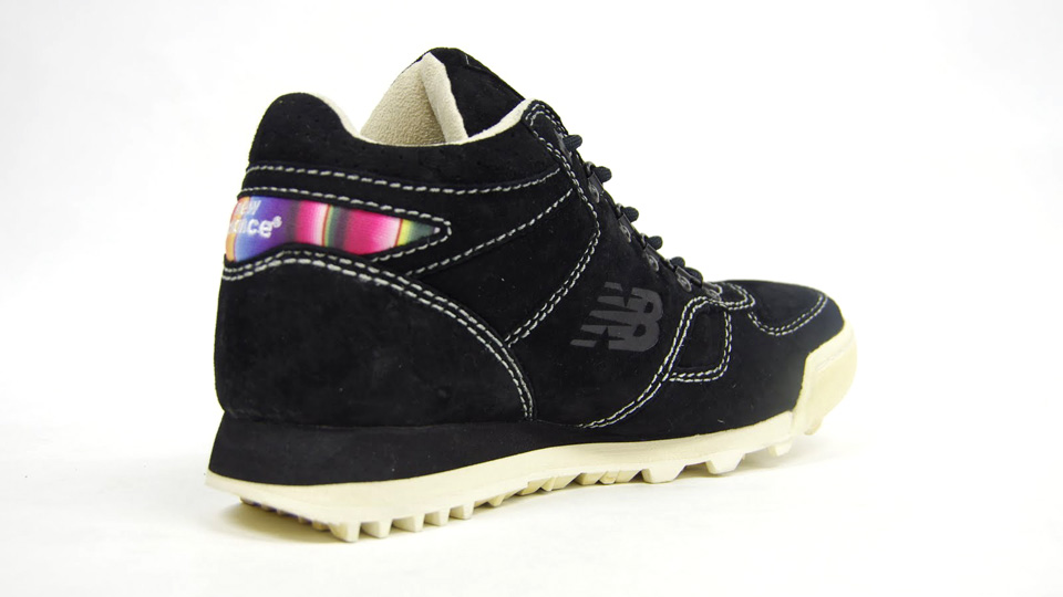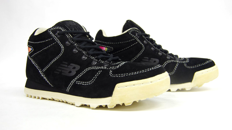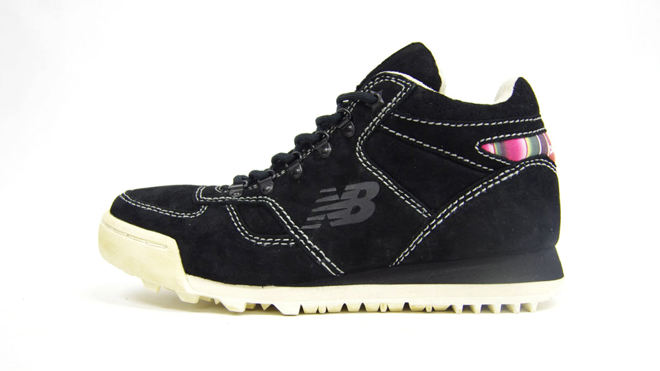 The NB H710 was featured on our site a few times in different forms, with this one featuring the hiking boot form, solid, rugged midsole and reinforced lacing. The shoe also sports an all black suede upper with white contrast stitching, and a ‘mexican blanker’ patterned heel tab.