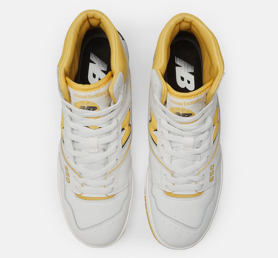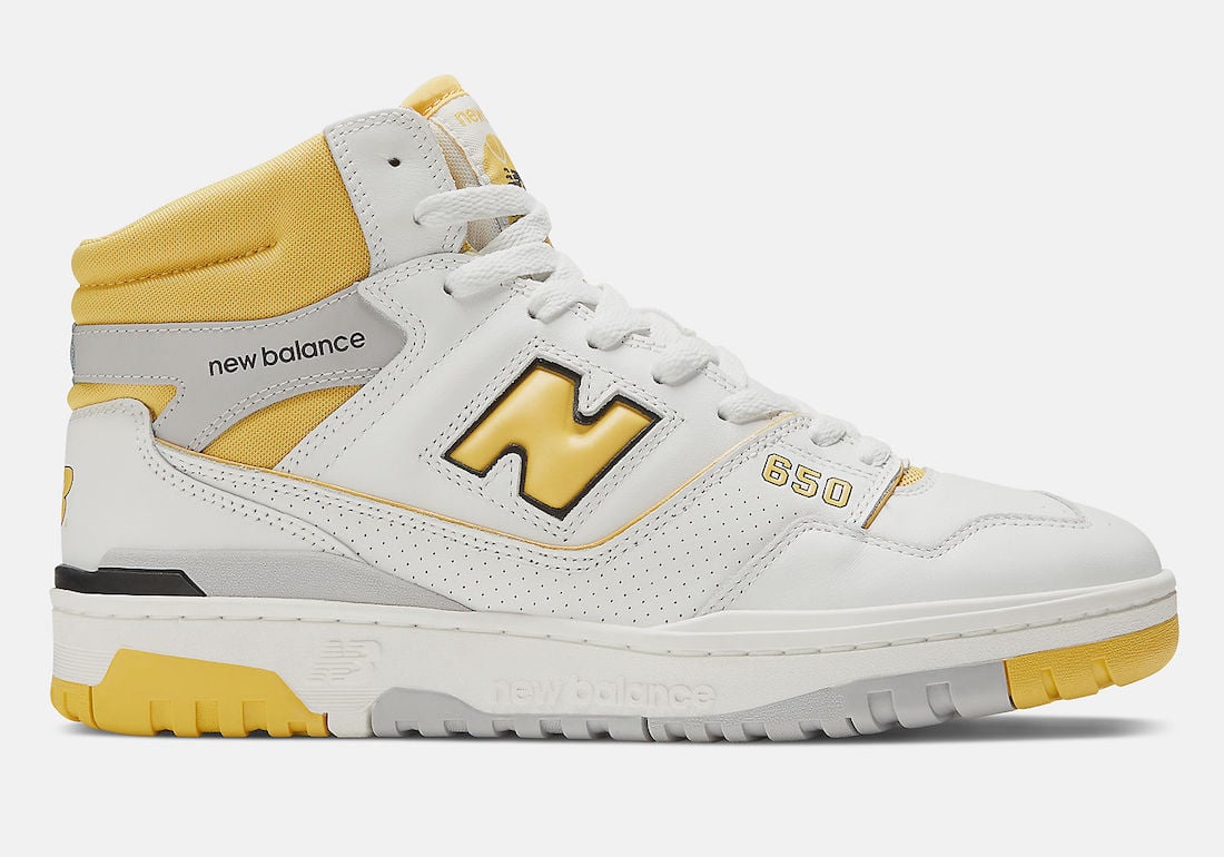 Highlighted in a White and Honeycomb color combination. This New Balance 650 comes with leather and mesh on the upper and the signature perforations on the sides. Dressed in mostly White throughout, Yellow adorns the โNโ and โ650โ branding, collar, and tongue branding. Finishing the look is Grey details.