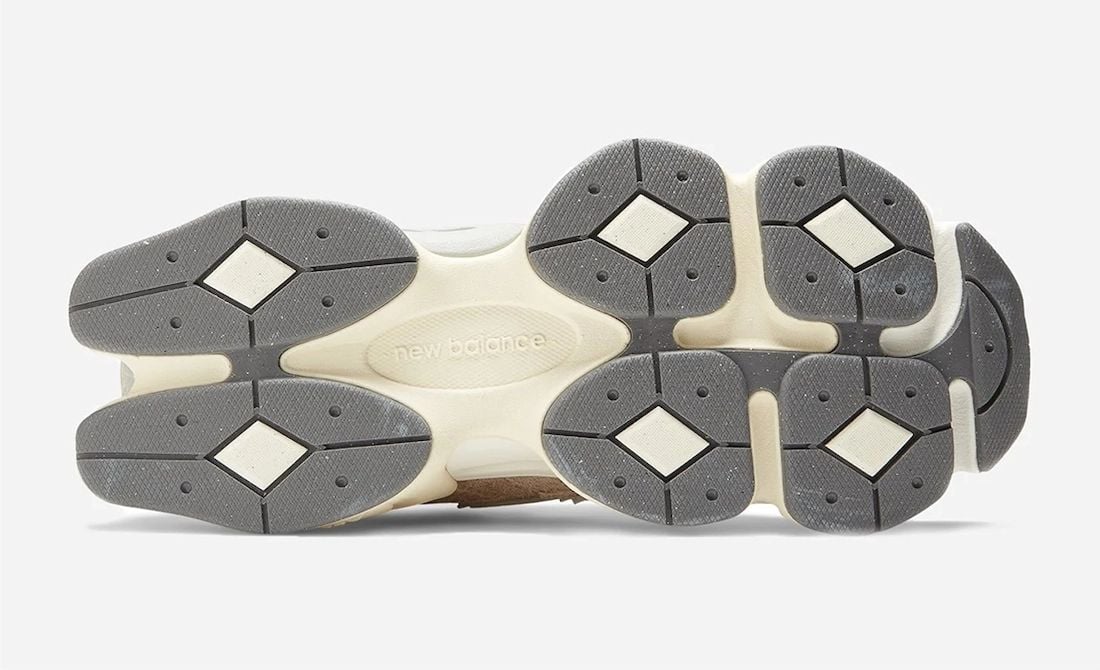 Looking closer, this New Balance 9060 comes constructed with leather, mesh, and suede. Utilizing White mesh across the base, Tan suede overlays, and Off White leather on the โNโ logos and heels. The rest of the New Balance branding appears in the signature locations, while the shoes come with a dual-density midsole paired with ABZORB and SBS cushioning. Lastly, a diamond pattern outsole finishes the look.