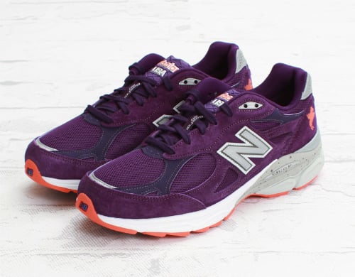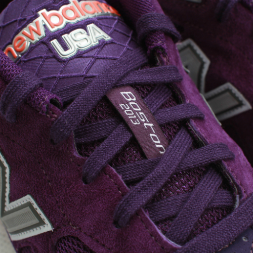 This “Made in USA” silhouette comes made with suede, leather, and mesh materials, but also displays a purple base with orange and grey accents throughout for a rich finish. Ironically, these runners also feature marathon tagging along the lace loop and branding of Paul Revere riding a horse at each back heel. And for those who didn’t pay attention in history class, he was the guy who tried to warn the Americans that the British were coming.