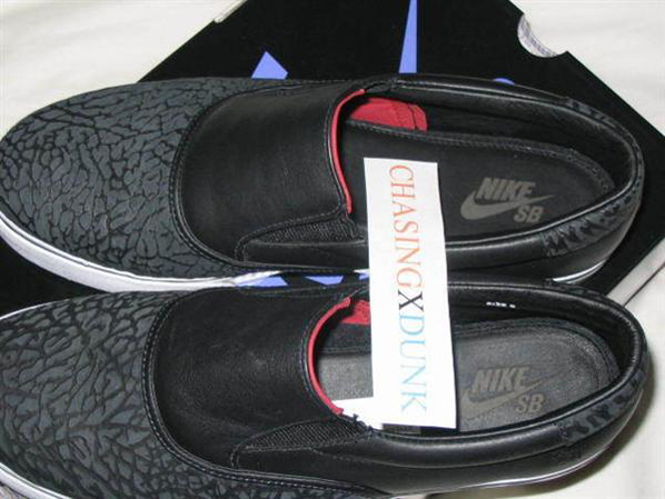 New to a lot of people and even Nike SB fans is this pair of Slip-Ons. Throughout the toe box their is cement print and on around the sides feature solid black leather. With a little bit of red on the inside tongue this model resembles the Nike Dunk Low Supreme. Via ChasingxDunk.