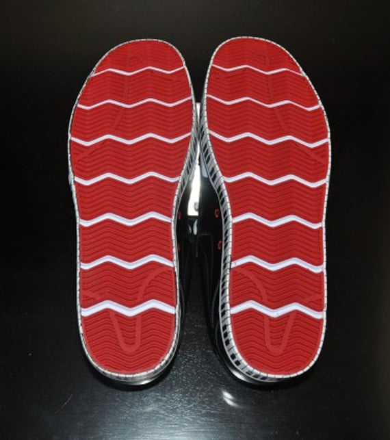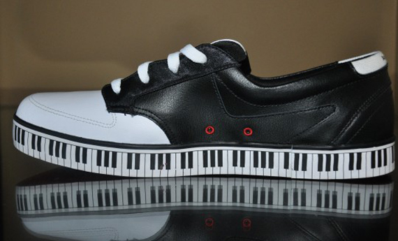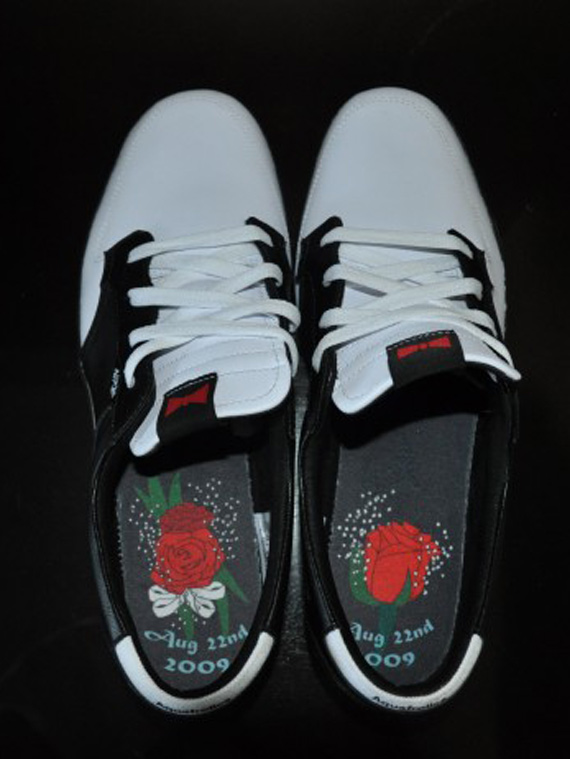 To promote Nike 6.0’s latest wakeskate project film “Aquafrolics,” Nike 6.0 has releasedย the Nike 6.0 Braata Prom Pack. The shoe comes with a matching aqua tee shirt with a tuxedo print on it. The shoe features a black and white leather upper with red Nike swoosh stitching. It also sports black tuxedo satin material on the inner lining, and a gaudy piano key print on the midsole. The red outsole is divided by white zigzags to give the shoe some more contrast. The insole showcases the date of the premiere and a rose design to match the roses that go along with the shoe in its rose box.