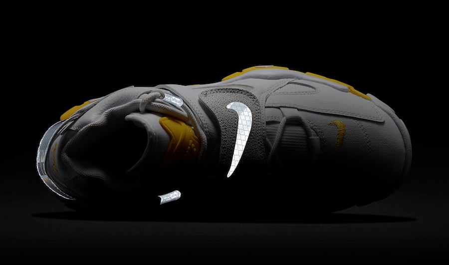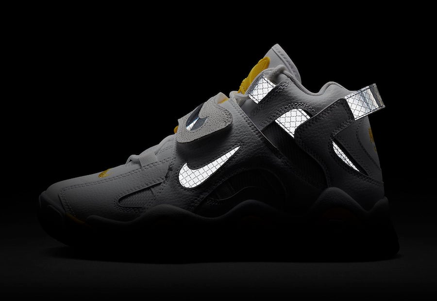 This Air Barrage Mid comes with a clean and simple color combination while constructed with mesh and leather. Utilizing White leather across the upper while Yellow lands on the tongue label, Swoosh just above the toe and across the midsole. Other highlights includes speckled detailing on the mid-foot strap and Reflective throughout.