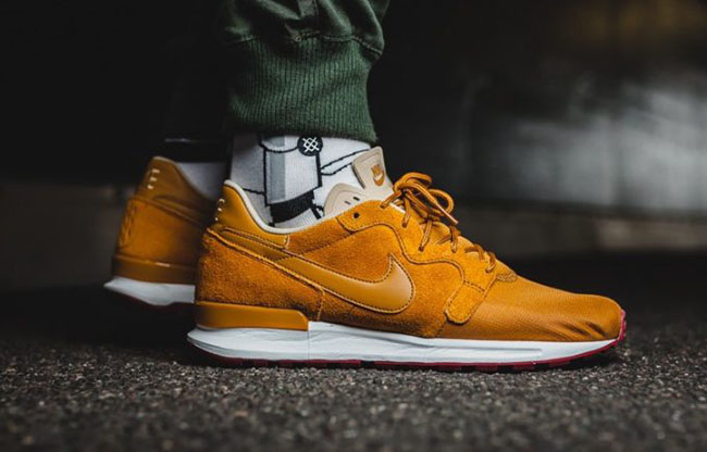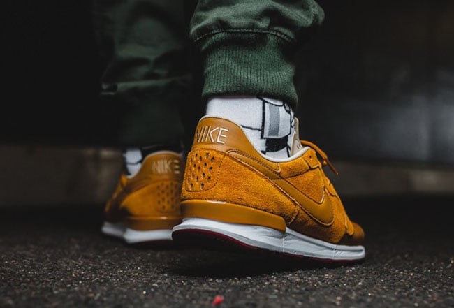 Looking closer at this Nike Air Berwuda, it features a Desert Ochre and Linen color combination. On the panels and overlays we have the use of suede while textile lands on the toe and leather on the Nike Swoosh and heel. Linen is placed across the tongue while White hits the liner and midsole. Finishing the look is Gum added to the outsole.