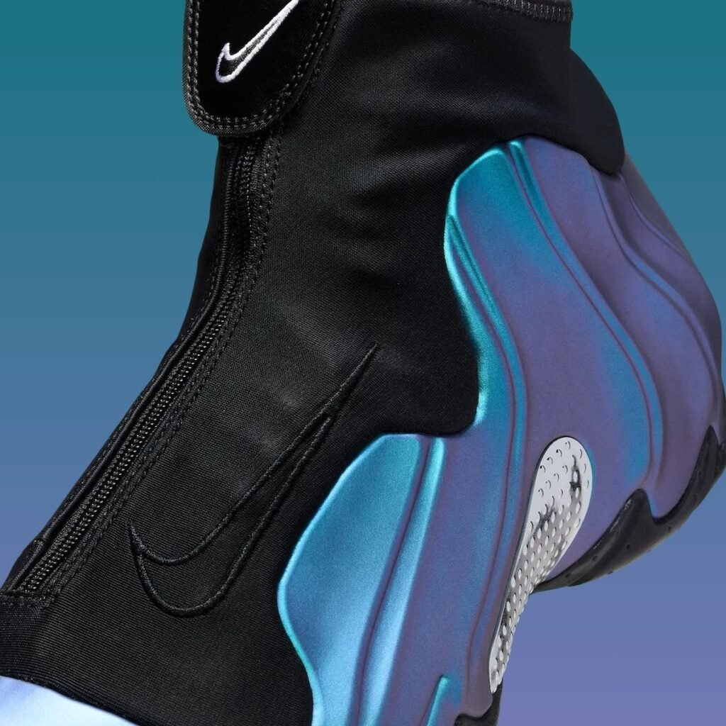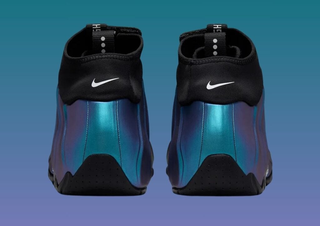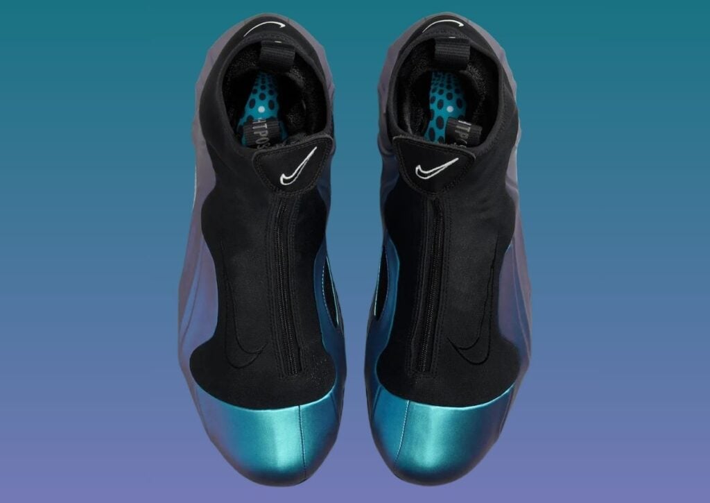 This Nike Air Flightposite One features an Off Noir, White, Dusty Cactus, Persian Violet, and Metallic Silver color scheme. As you can see, the shoes feature an iridescent upper that shifts from Dusty Cactus to Persian Violet. In addition, Black appears on the zipper shroud, pull tabs, and the rubber outsole. White appears on the branding, and Chrome adorns the mid-foot shank plate. Lastly, the shoes have a 3D pattern on the insoles.