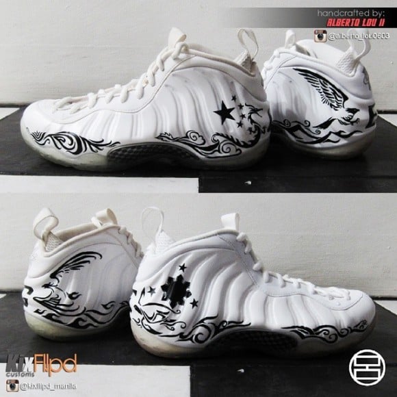 The Nike Air Foamposite Freestyle customs by Alberto Lou are entirely white, with tattoo style graphics on the curvy uppers of the Nike Foam Ones. The base sneaker model was the Nike Air Foamposite One “White/Metallic Silver” shoes that dropped a little over a year ago, but Lou took to his trusty paint brush and added some finesse to these simple and clean shoes. Images of a dragon, eagle and the Philippine Star can be seen on the glossy uppers, along with spiraling black lines resembling oceanic waves and wind currents on the base of the shoe. “G.E.” is also prominently scripted on the rear paneling.