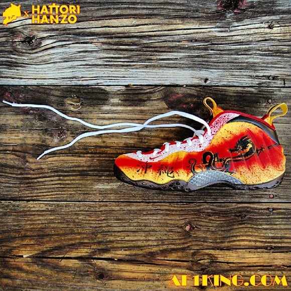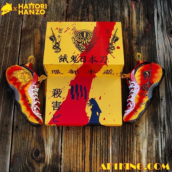Last time we saw a “Kill Bill” themed pair of kicks from Gourmet Kickz, he just about shut down the custom game, everyone loved it and it became one of his top designs for 2013. On to the new year and Gourmet decided it was time for another Kill Bill pair, this time around it’s the Nike Air Foamposite getting the “Hattori Hanzo” treatment, complete with blood splatter, a large dragon on the outside, a silhouette of a lady as well as Chinese symbols throughout. A black sole was used while the upper was yellow on the outer edges and a deep red towards the midsole of the kicks. Icy white laces really standout on the yellow, red-splattered, tongue. Red inner lining caps off another fantastic creation by the team at Gourmet Kickz that even comes in a dope customized box.