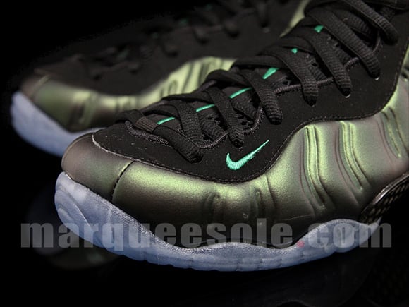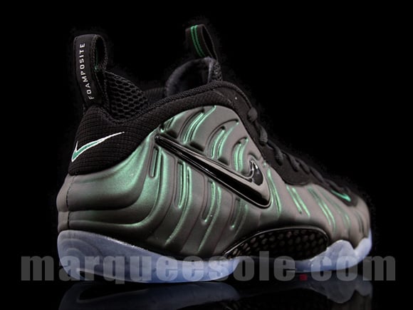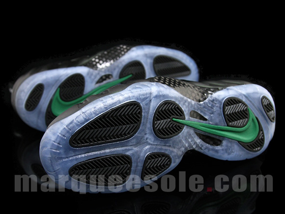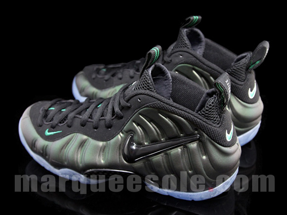 Wale was seen wearing a pair of Nike Air Foamposite Pro ‘Dark Pine’, and now we have a detailed look at the sneakers that will drop this Fall. This pair of Nike Air Foamposite Pro uses a dark pine with metallic finish on the uppers, black runs through the eyelets, sock liner, tongue, carbon plate, and heel, green highlights are present on the Nike checks, and lastly a blue tinted translucent sole. September 2011 is the expected release date, but you can grab a pair now at Marqueesole.