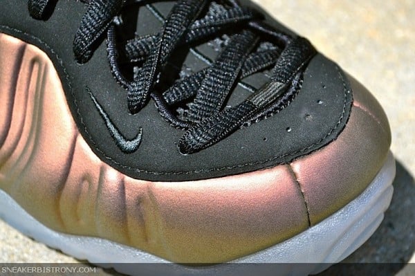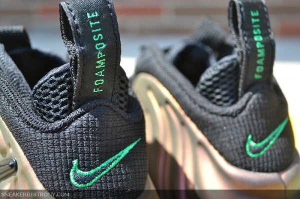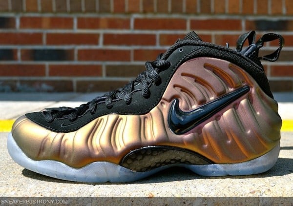 Featuring the usual black nubuck and mesh accents alongside an icy outsole, the kicks take their name from the hue of the branding hits that appear throughout and sport an iridescent Foamposite upper of gold, copper, red and green alongside a black jewel Swoosh.