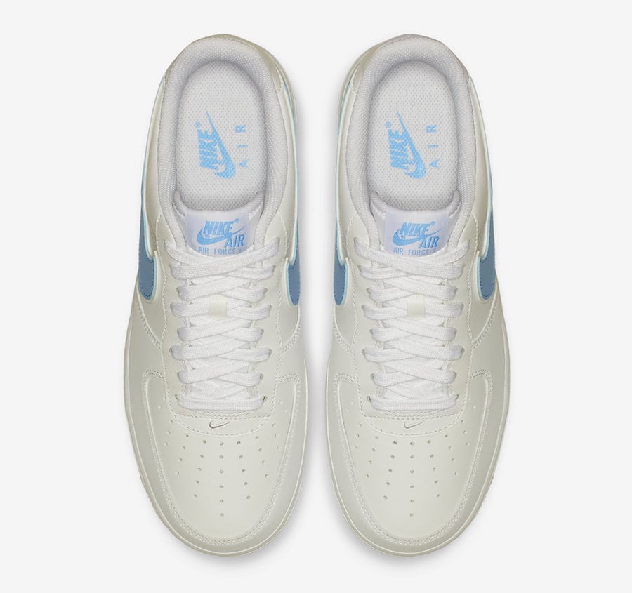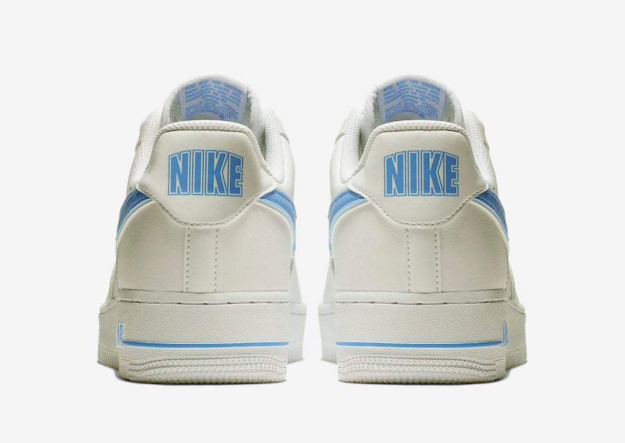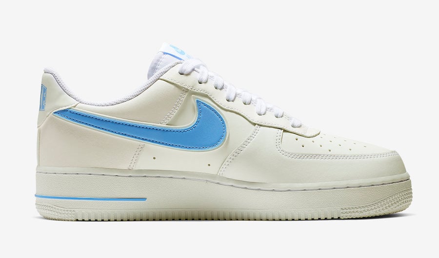 This Nike Air Force 1 Low comes dressed in a White and University Blue color combination. Constructed with a premium White leather across the upper while the same shade covers the midsole and outsole. Adding some pop is University Blue on the Swoosh logo, tongue branding and โNIKEโ written across the heel.